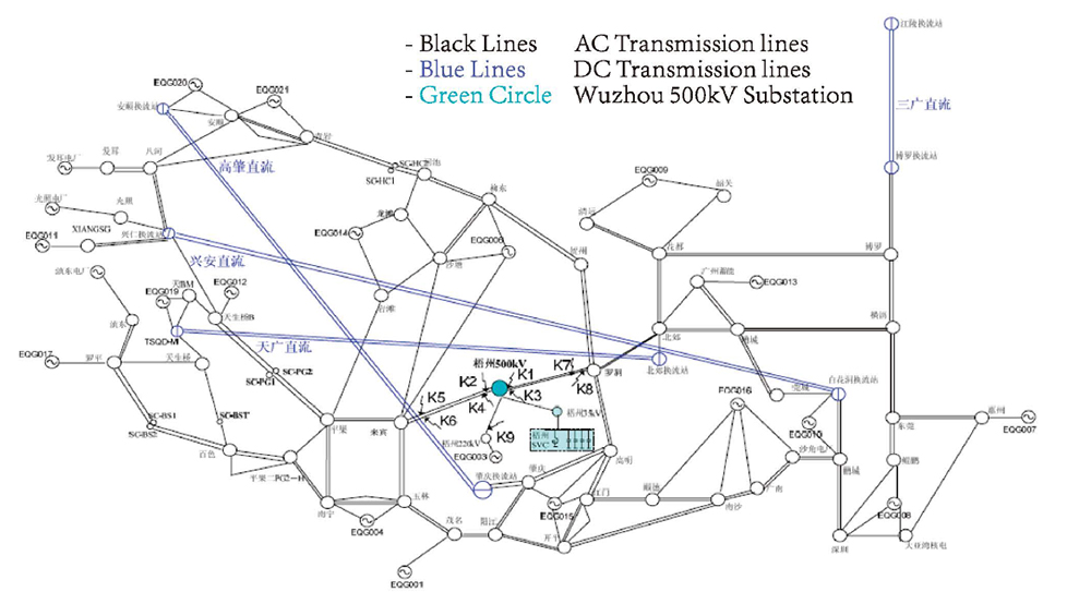 محطة التحويل Wuzhou 500 كيلو فولت من عقد الشبكة المهمة في وسط خطوط النقل هذه لاستقبال تدفق القدرة من كلاً خطوط النقل AC و DC القادمة من الغرب.
