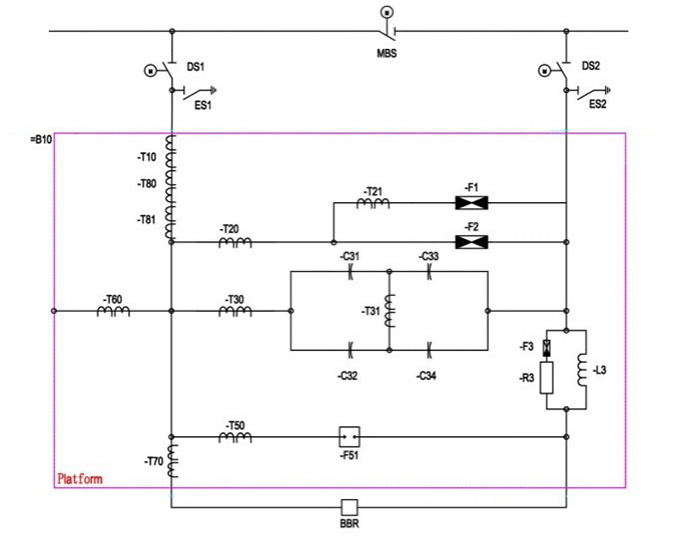 بنك المكثفات، صمامات تشغيل المحرك (MOV)، فجوة الشرارة، دائرة التخميد علاوة على منصة إلكترونيات الجهد العالي كلها مركبة على المنصة، بينما لوحات التحكم والحماية (C&P) واقعة في حجرة التحكم على الأرض. وصلات الألياف البصرية استخدمت للاتصالات من وإلى إلكترونيات منصة الحهد العالي (HV).